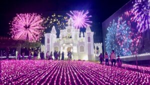 あまり興味がなかったのですが、イルミネーションで表現される藤の花、花火、素晴らしかったです。